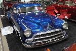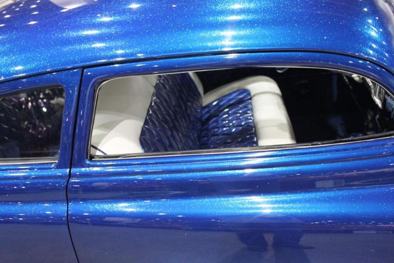 HOK metal flake blue with cream scallops, Chopped 5 in front 6 in the rear. Lowered rear wheel openings, extened rear quarters, olds headlight, custom rear bumper, shaved, etc etc..