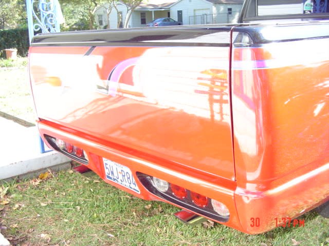 Shaved bed, electric roll down rear window, custom hood, custom red paint with way too much blue pearl. so yes it mostly looks pink