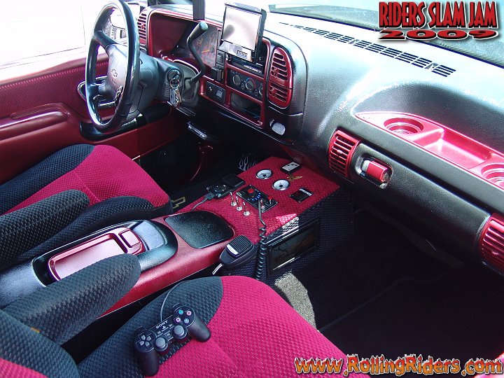 Dash, door panels, and all plastic trim pieces have all been painted, recovered stock seats, custom headliner, Custom center console with 2 Power Acoustik 7" screens on each side, ACT 8" dropdown monitor in headliner, LED interior lights, Billet door seal plates, Billet door jam vents, Billet door panel vents, Billet interior door handle covers, Nu Image flame gauge pod