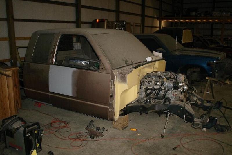 DUSTY WITH NO FRONT CLIP AND A BED STANDING BESIDE IT WITH NO TAILGATE SKIN AND NOT SHEETMETALED INSIDE