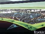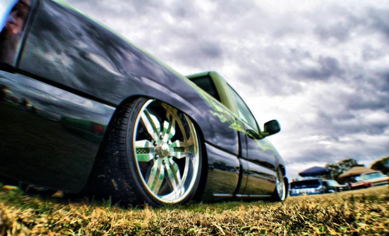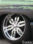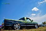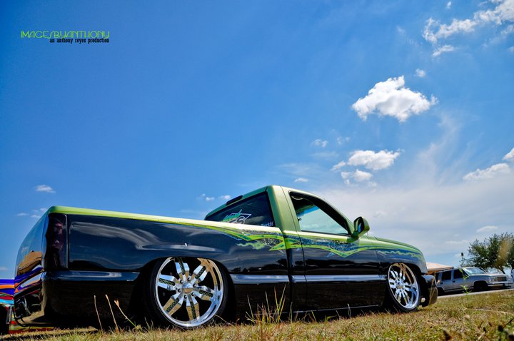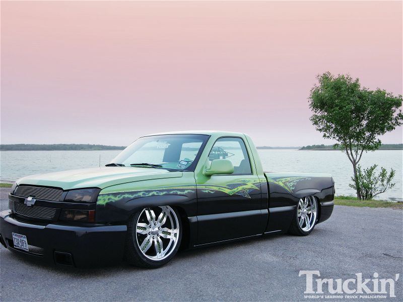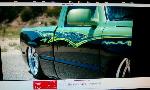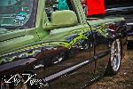 Shaved door handles, tailgate handle, gas door and emblems. Relocated gas filler to bed. Tubbed and smoothed bed. SS front bumper, roll pan in rear. Billet grille. Smoked out lights. Line-X in bed. Custom two tone paint with VW Cyber Green and Chrysler black metallic. Bio-mechanical graphics airbrush and pinstriped. Paint done by Patrick Reid out of Galveston, TX.