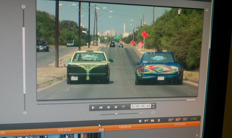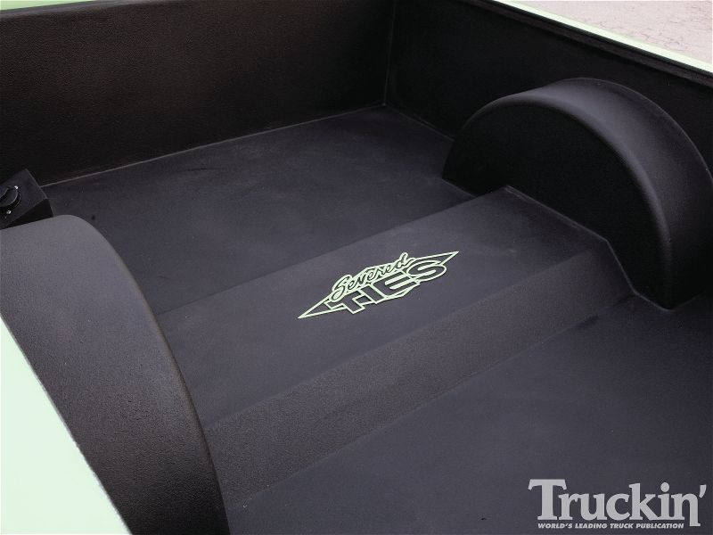Sanded and smoothed dash and door panels. Removed stock headrests. Every plastic in the truck has been painted. Interior done in green gator and black vinyl. Custom flamed headliner done in black vinyl. Black carpet. Custom billet SEVERED TIES steering wheel by Colorado Customs. Billet SEVERED TIES rearview mirror, billet knobs, billet shifter. Interior done by Jerry Vincent -Jerry's Custom Upholstery out of San Antonio,TX.