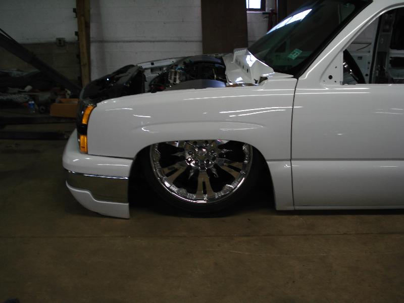 Bodydropless Chassis with stock front clip and mandrel bent rails from the firewall back built by Bad habit Customs, Chrome Tubular upper and lower control arms built by Bad Habit Customs. The rear is being built by Haggard Fabrication and designed by me, it will consist of a cantilever with dual adjustment shockwaves and aluminum rocker arms.