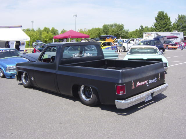 Flat Black, shaved handles, mirrors, drip rails, molding on the cab, emblems, side markers, tailgate, gas door(relocated to bed)...Thanx Killer Ridez