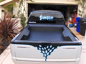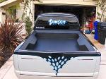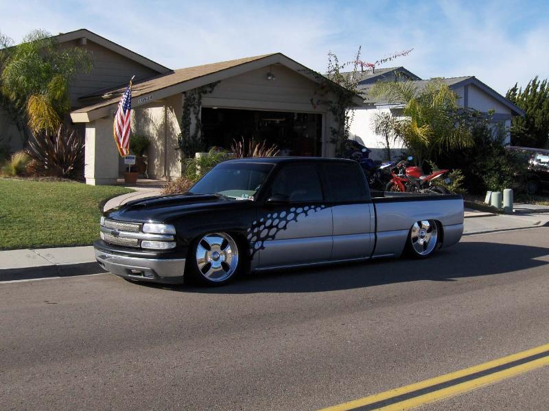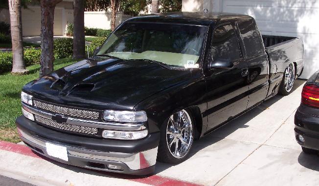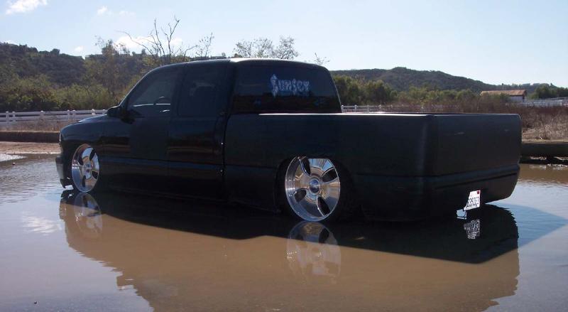 Ram Air hood, Speed Grill, Clear front lights, Low pro side mirrors, stubby chrome antenna, Shaved bumper, tailgate, door handles, 3rd brakelight replaced with a 5"x1/4" Hyper LED light, rain gutters, bed holes and gas door. Engine compartment modified for 22"s and custom tubs put in. I just raised and boxed in my bed.