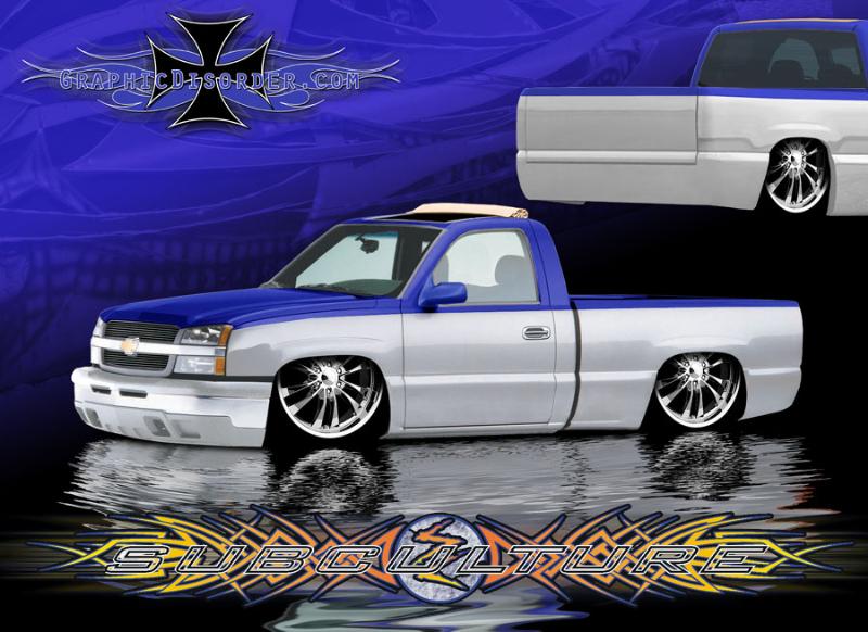 escalade rear door handles, shaved third brake light shaved tailgate and molded roll pan shved stake holes smoothed and painted bumper pad and lower valance street scene mirrors ragtop billet grill and bow tie