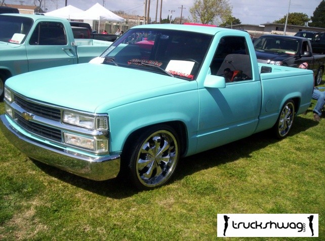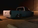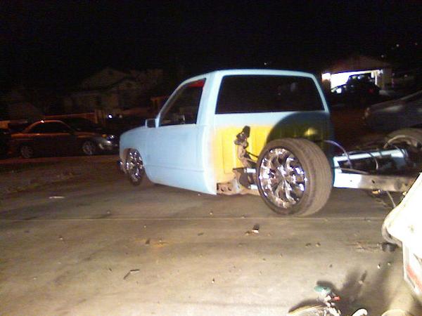Shaved doors, 3rd brake, stake pockets, welded rollpan, license plate relocated into tailgate, White primer with alota squirts of blue and a couple squirts of green.