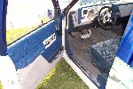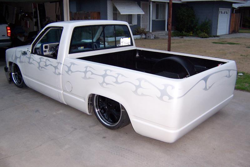 fully shaved tail lights, tail gate welded shut, roll pan, doors, upper bodyline, stake holes, mirrors,section an inch either way out of the bumper,bed tubbed,custom maltese cross mirrors,custom two tone paint pt cruiser electric blue on top escalade white on bottom with metallic silver flames seperating them striped in hok lime green