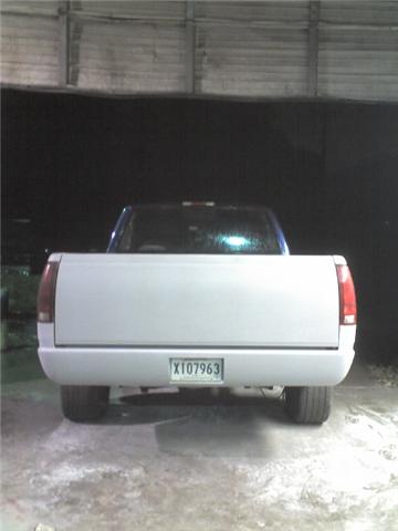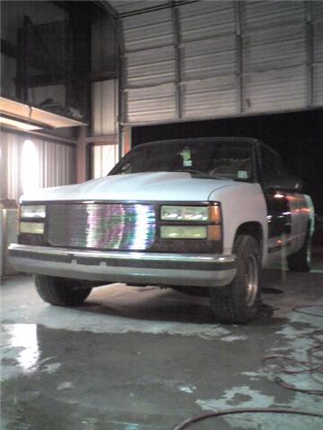 cowl induction hood, gmc grille shell with 31 bar billet, clear headlights, corners, parking lights, and old shcool clear tails, shaved stake pockets, shaved tailgate handle, molded roll pan
