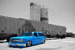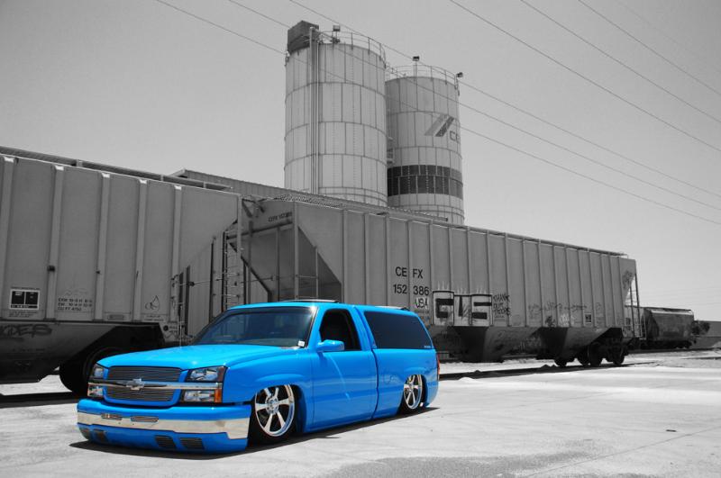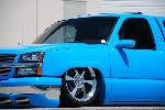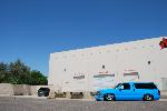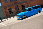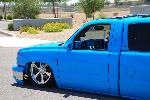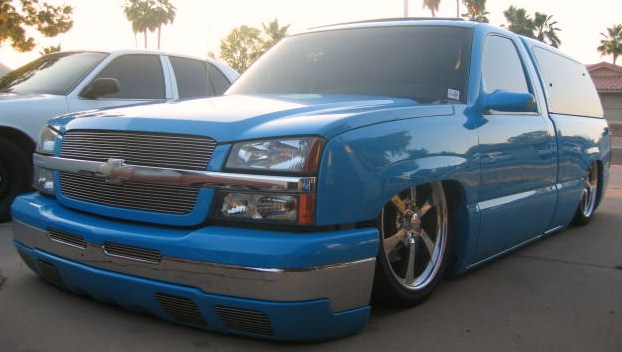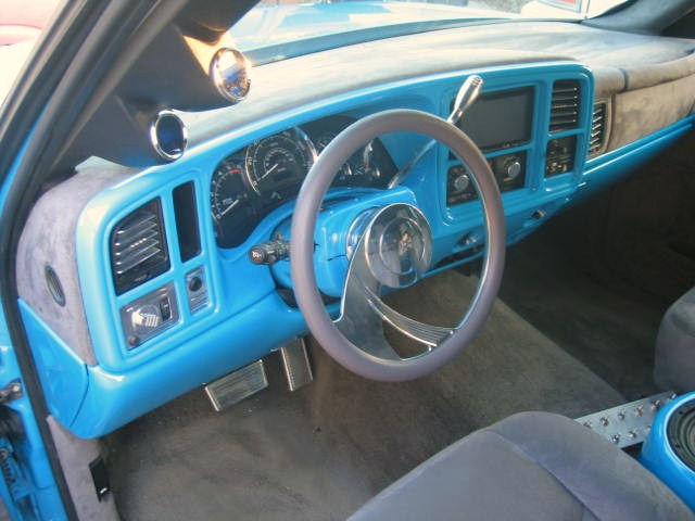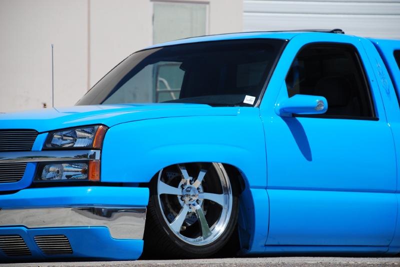 Shaved door and tailgate handles, Sir Michaels roll pan, Leet shell, billet front end, Street Scene electric mirrors, dual rag tops, Porsche Riviera Blue.
