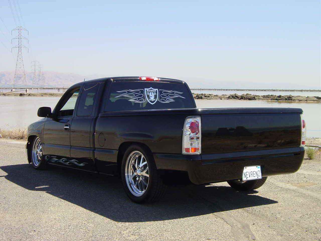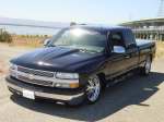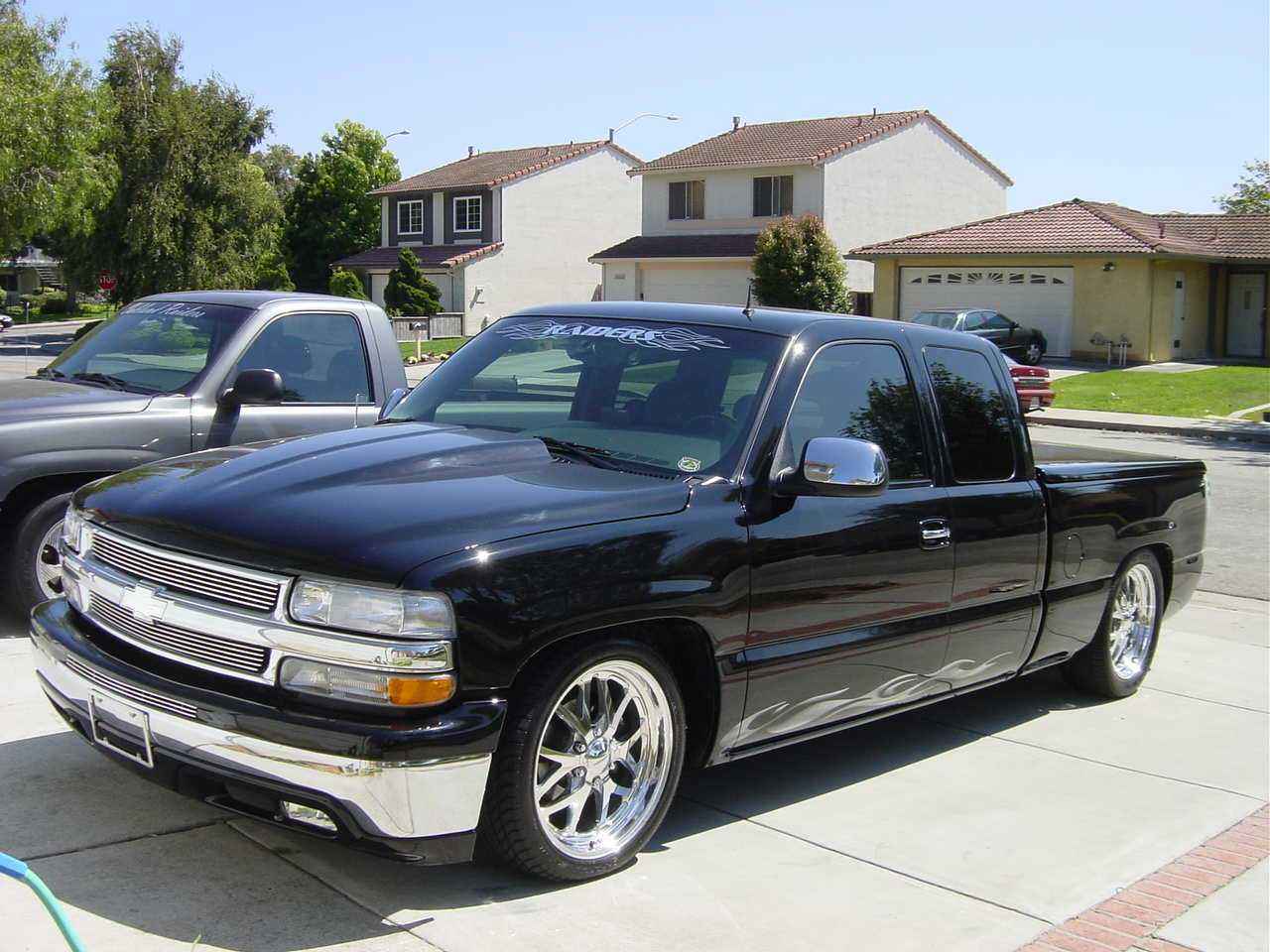 Black with Silver Flames, Chrome Tahoe grille w/billet insert, Billet bumper insert, Painted black bumper cap, painted black air damn, Reflexxion cowl induction hood, Snugtop bed lid, Sirmichaels welded in roll pan, shaved tailgate,billet antenna, Escalade chrome door handles,Street Scene Mirrors