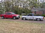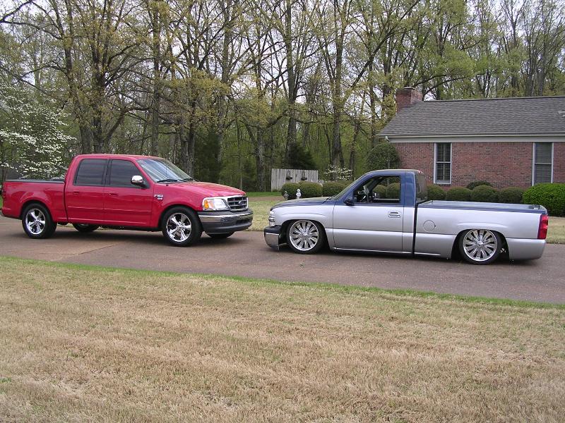 Two tone paint Dupont Chroma-Base Silver Pearl Metallic and Chroma-Base Indigo Blue Pearl Metallic, Billet Grill, Billet Bowtie, Euro Clear Parking lamps, Shaved Tailgate, Tahoe Chrome Grill, Hyper White hi/lo, Street Scene Electric Sport Mirrors, molded in Sir Michaels Rollpan, 2003 Silverado Taillights, tubbed out the bed and sheet metaled the floors and walls