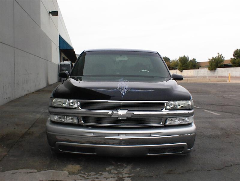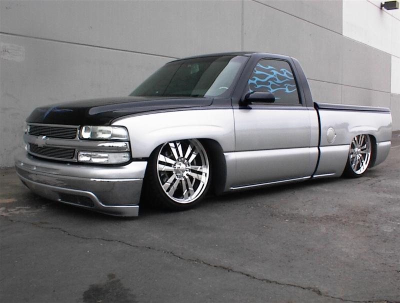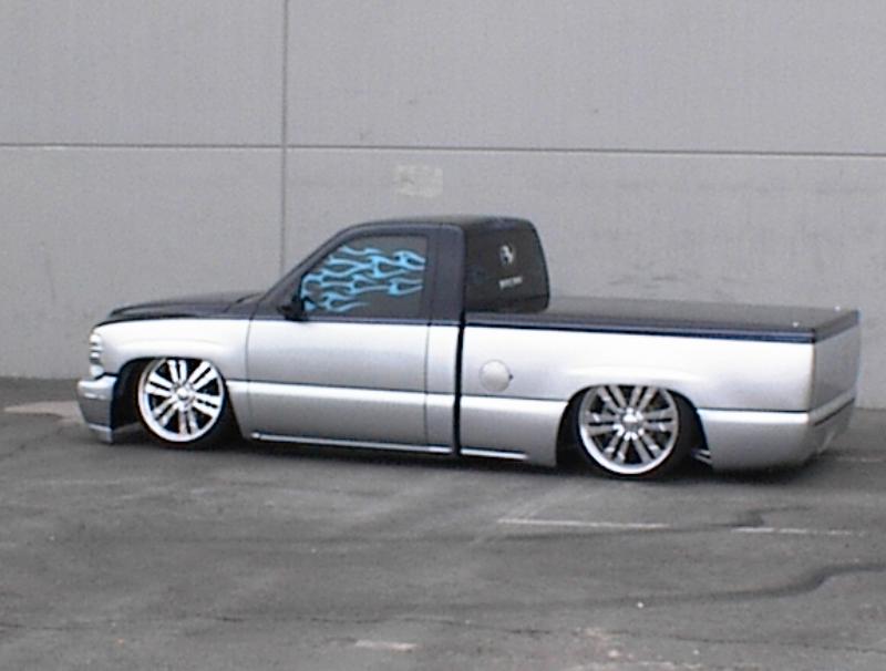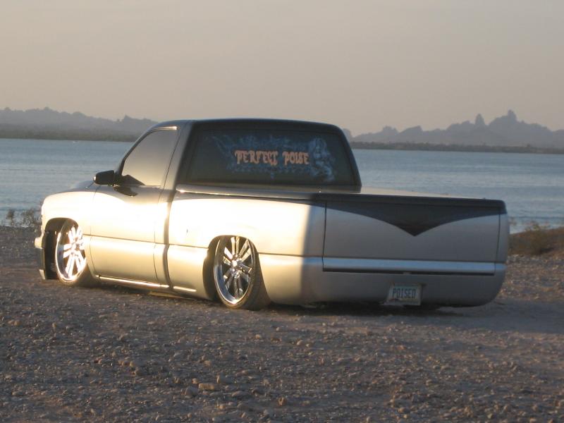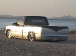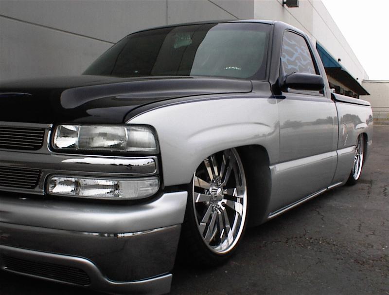 It started with a 6"fabtech lift and a three inch body lift! But I'v always road low. So next went a 5-7 djm kit. Noww!!! It sits on KP Components full air ride. Slam Speciality Bags and SMC 1/2" valves. All hardlined by Justin Mull from Perfect Poise. After I took out my soft line. (the hard way) My link bars have been jet coated near chrome, the axle tube has been powdercoated candy coated cobalt blue, all held together with chromed nuts and bolts. My bag cups from KP Components are chromed and my DJM control arms are powder coated blue also.