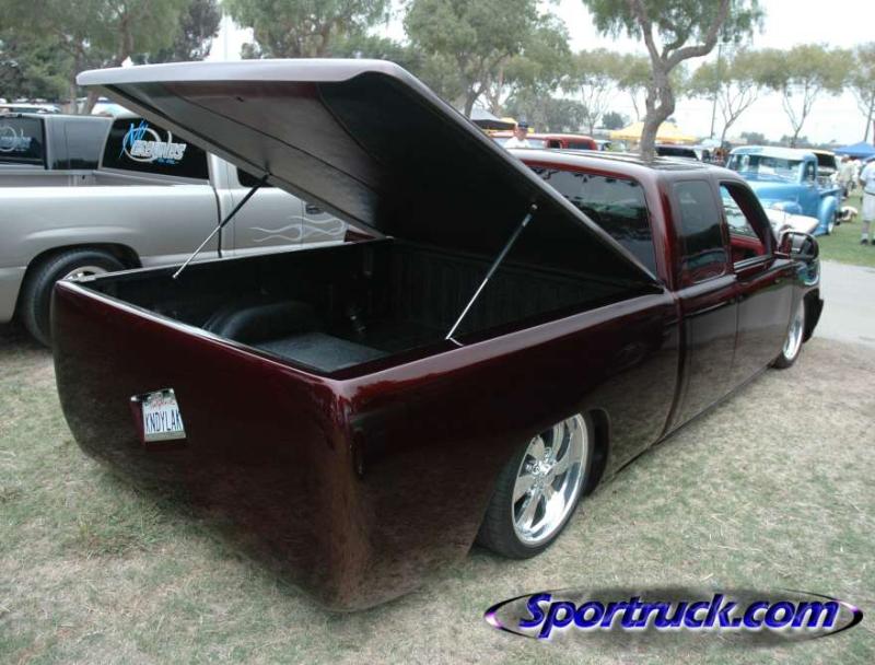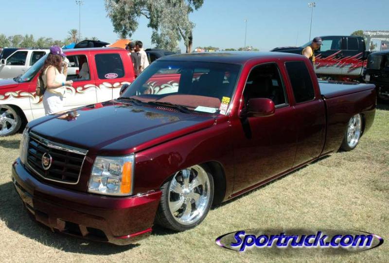 SOLD - House of Kolor Burgundy Kandy Paint, Caddy Clip, Molded shut bed with color-matched LEDs, FULLY SHAVED including ALL BODY LINES. Paint & Body done by Carlos Trejo @ Kaotik Kustoms in Reedley, CA.