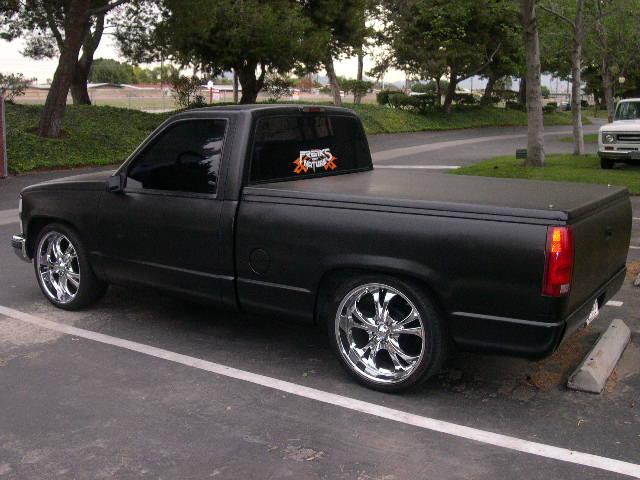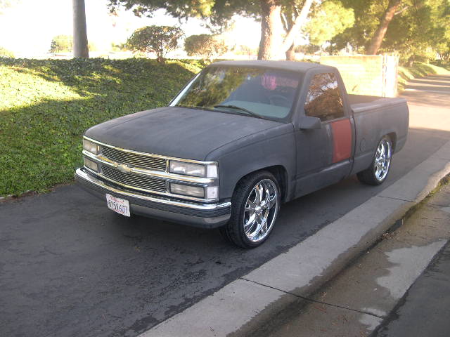 Shaved handles, and primer,sport mirrors, rollpan, billet grill and bowtie.