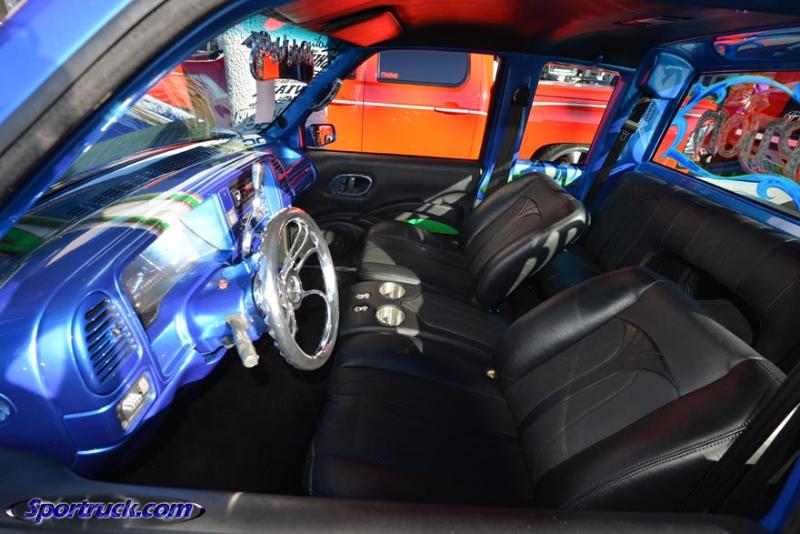 Upholstery in perforated leather and black vinyl, front seats cut down and all reformed, back seat recovered to match, custom door panels, black carpet and headliner, lots of interior billet pieces