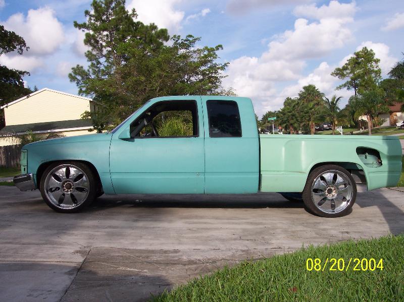stock floor layin door on 22s. Fully shaved, full primer. Molded on 2003 toyota tundra tailights. Custom rollpan w/o license plate box because thats all they sell for stepsides with stepshavers, raised, widened and reshaped rear fenders to match lights and to clear for 22's. Sheetmetal and rhinolined bed. Shaved and rhinolined firewall. Booster relocated to underneath driver stepside.