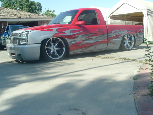 ss front bumper, custom cleared lights, tailgate shaved with molded in rollpan,2 LEDS in pan, shaved 3rd brake, ss side mirrors, billet grill,cadillac handles, custom flames