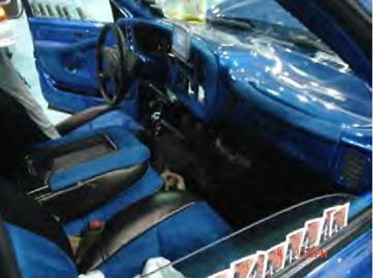 dash smoothed and painted two tone like exterior, black leather and blue suede seats , suede head liner,empire motorsports billet, customs console with 2 7" screens , door panels smoother and painted to match paint