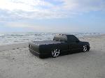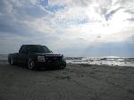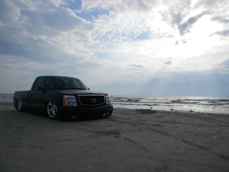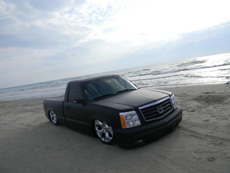 05 cadi front end,shavered up,billet motorcycle gas cap,camero lime green with flat black flames,sheet metal bed with Grant tubs