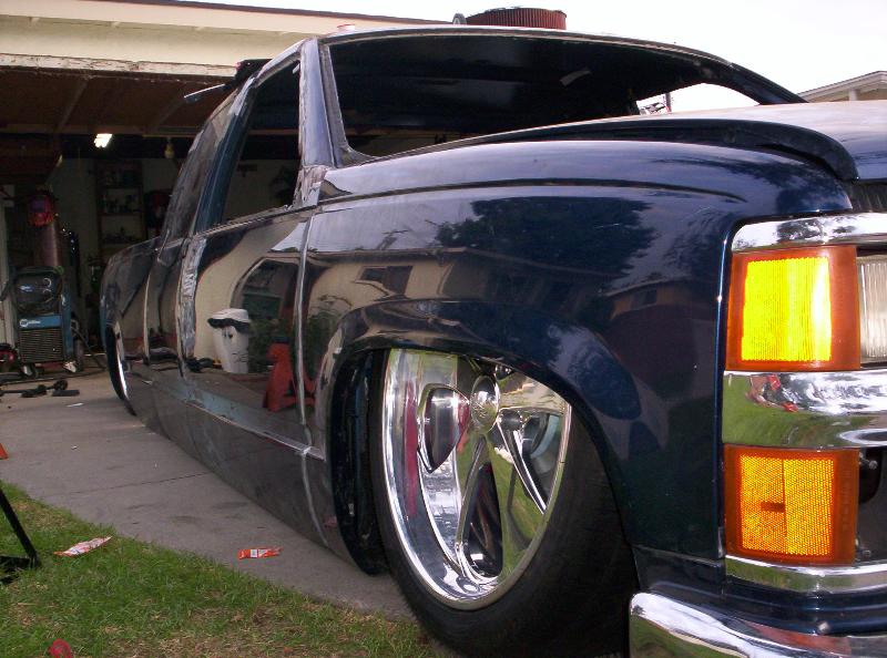 Shaved door handles, gas door, rain gutters, ant, taillights, roolpan, molded tailgate, frenched plate, suicide doors, chopped top 2 1/2 in rear 3 in the front all factory glass, stockfloor body dropped to the door sectioned bed so top of bed lines up with bottom of window