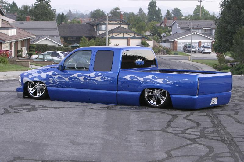 shaved handles, antenna, taillights, stake bed pockets, Grant Kustoms skin combo(rear molded shut)Painted Tru Blu with silver metal flake flames/Matrix System Paint/Blue sprayed by Musso Motorsports/ graphics and pinstripping by Kaotic Ryan