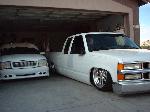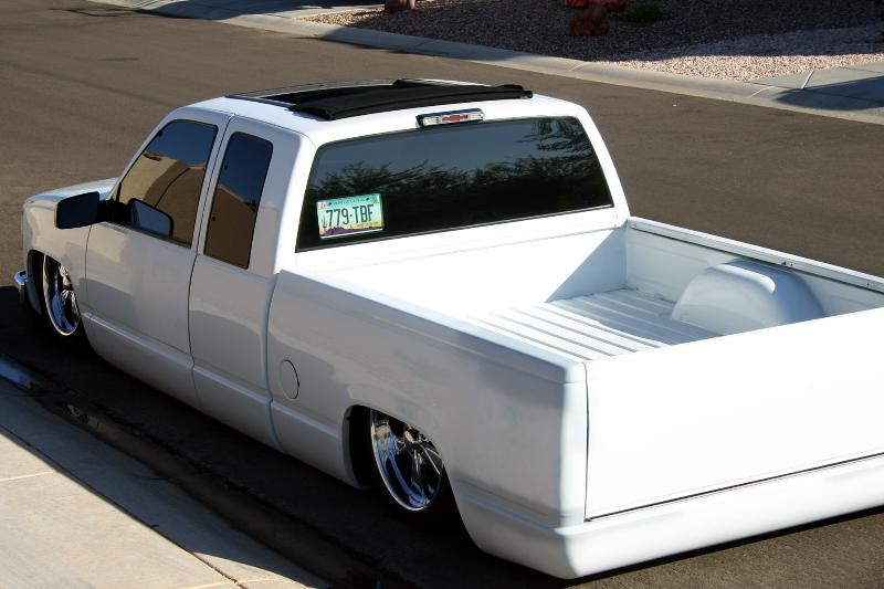 billet grillz, clear head lights, marker and corners up front, trimmed front valance to lay even, licence plate relocated to back window with billet lighted frame, shaved taillights, fbi roll pan,raised bed floor, shaved handles, shaved tail gate, bed caps, whit primer, dark ass tint! 40 x 40 sliding rag