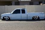 stockfloor bodydrop (bodydrop shop) the waiting game....... 4 link bag on bottom links, shocks rides like a dreram, slam baggs, Spindals up front with triminz for steering linkage, 2-450's 2-3 gallon tanks, guage in cab. 4 push buttons on dash.