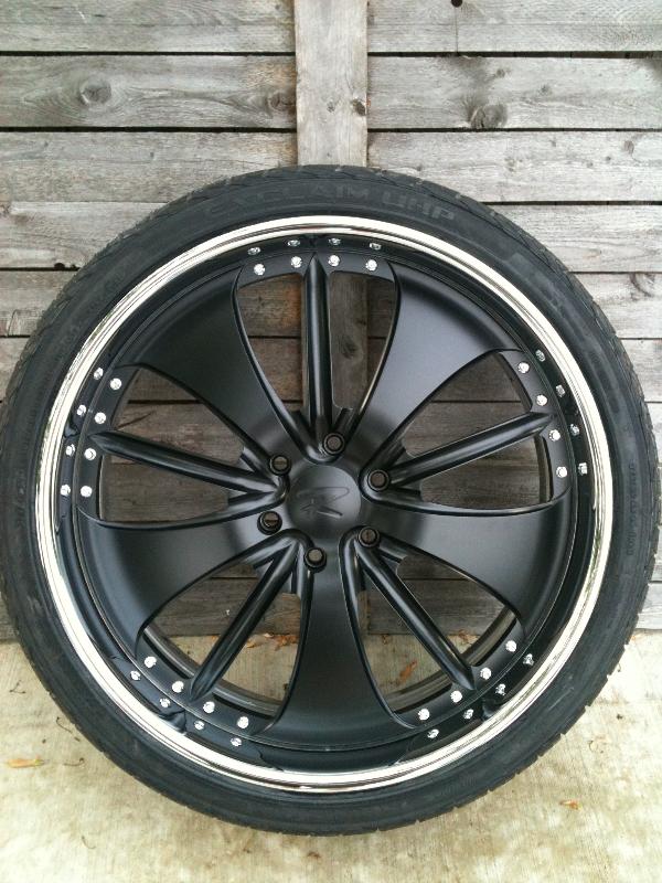 24x9 3 piece billet RaceLine Titans, matte black centers, chrome outter hoops wrapped in 275/30/24 General UHP Eclaim tires. Full Aluma-Sport Baer Brake Kit front and rear all sandblasted and re-powdercoated bright red calipers/silver rotors.