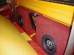 it has sony cd player with 2 memphis 10in subs with 2 6in threeway memphis speakers in the kick panels. it has a memphis amp mounted behind the seat with the custom built boxes for the subs covered in red carpet. it has some tweets beside the sunvisiors and 2 6x9s in the right and left rear of the rocker panels.