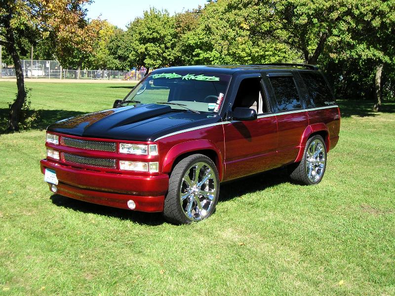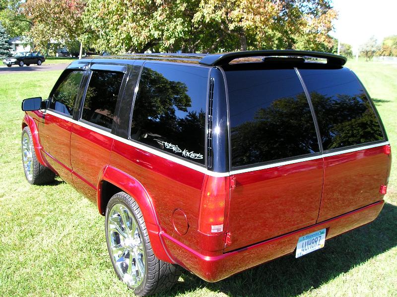 Two tone candy red and black with a silver stripe and lime green pin striping. Shaved handles and roof rack and welded in roll pan. Oh yeah, and a growl hood.