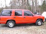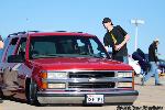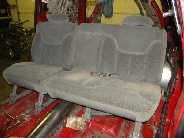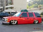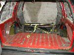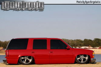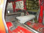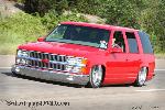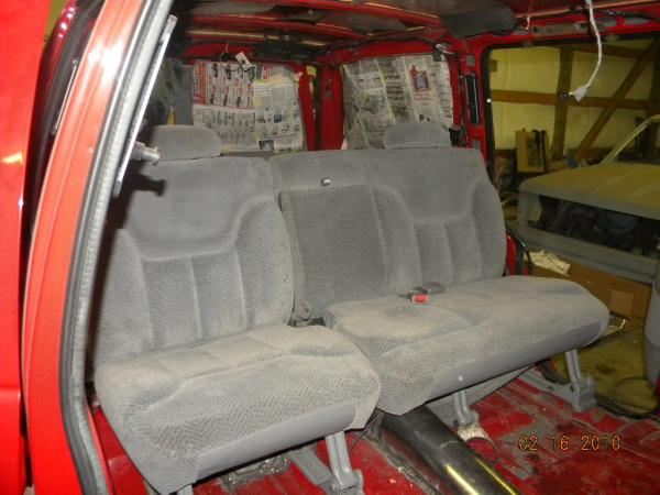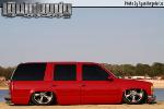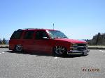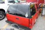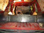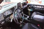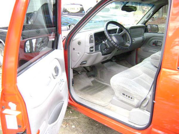 Driveshaft tunnel and fully sheet metaled rear notch and bridge area, fully sounddeadened, black carpet, 02 GMC front seats, modified rear seat, handmade black leather and black suede seat covers, black suede headliner, shaved stock front seat belts, shaved rear cargo cover holes, shaved rear seatbelt holes in B pillars, billet grab handles-dash-door paneltrim-ac vents-climate control-headlight switch-blinker-gear shift-gauge surround-speaker covers-door vents, white face gauges, Billet Specialties steering wheel with bowtie horn, dash dyed black, door panels dyed black with black suede inserts, 7" monitor molded into passenger airbag, 2000 Eddie Bauer Expedition Console, 7" in dash flipout dvd monitor, 7" monitors in head rests, Airlift guages in A pillar pod