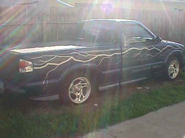 APC sport mirrors, Steel Cowl induction hood. shaved tailgate handled. Molded roll pan, Duel exhaust ported out the roll pan. Clear corners. Crystal series head lights from APC. Clear euro tail lights from APC, 3 sets of strobes in headlights 3sets of strobes in tail lights 2sets of strobes in fog lights blue under carrige neons all around blue neon in grille and flush top toneau cover.