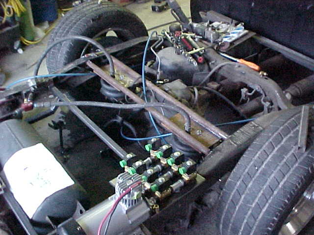 Now fully bagged fbss 2500's in front 2600's in back 2 link and 8 electric valves mic skull control apc air gages running 3/8 all the way around to 7 gallon tank Blow jax 3/4 horse compressor