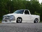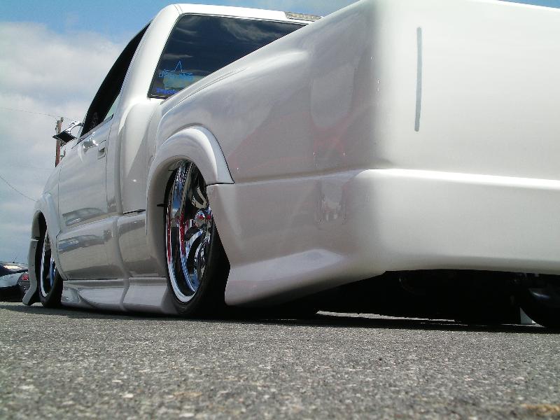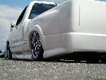 suicide hood, shaved taillights, tailgate skin LEDs, motorcycle mirrors, chrome grille with speed grille insert, billet step plates,