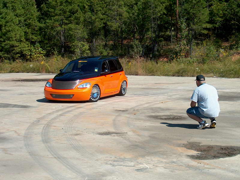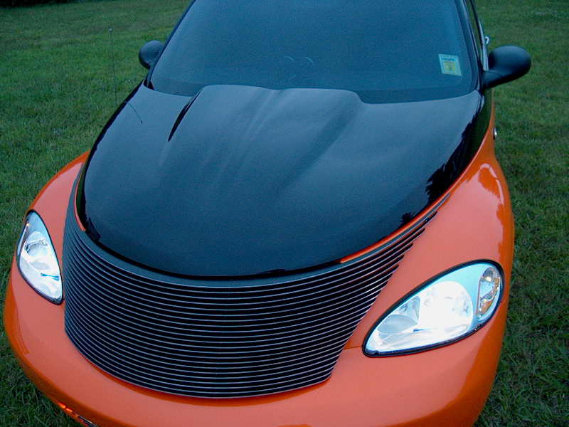 cowl hood,smooth rear and front bumpers, bilt wrap around grill and insert, wing, side marker lights, euro tails, all blue bulbs, House of Kolor black and Tangelo two tone paint, pin strip ,billet ant.polished cruiser emb. on hatch