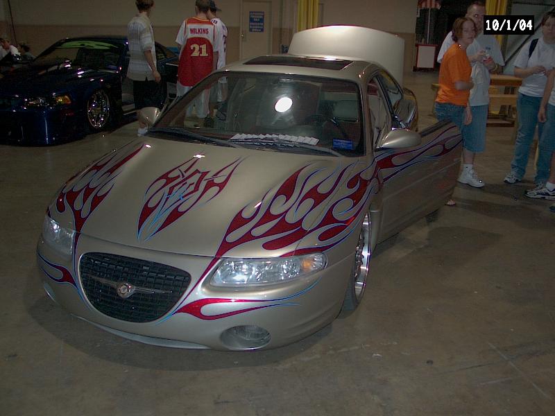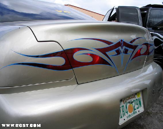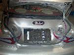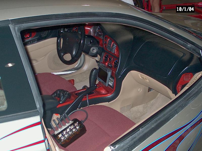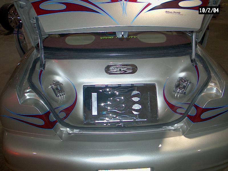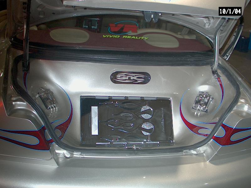 *Clarion TV Headunit *Clarion 6 disc changer (in glove box) *PS2 *2 PBX 12s *Audiobahn amp *Audiobahn mids and highs *Tsunami fuse blocks *All fiberglass speakerbox and trunk pan painted to match car with flames matching on trunk pan *ALL STEREO WORK DONE BY ScrapeN Customs (www.2scrape.com)