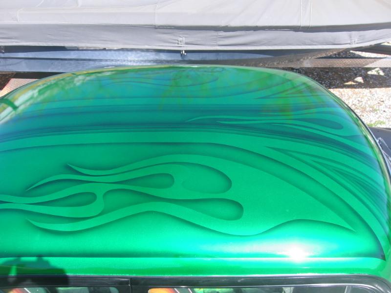 BLACK AND STAINLESS, SOME PINSTRIPE WORK, MALTESE MIRRORS, CANDY GREEN ROOF WITH PATTERNS AND FLAMES