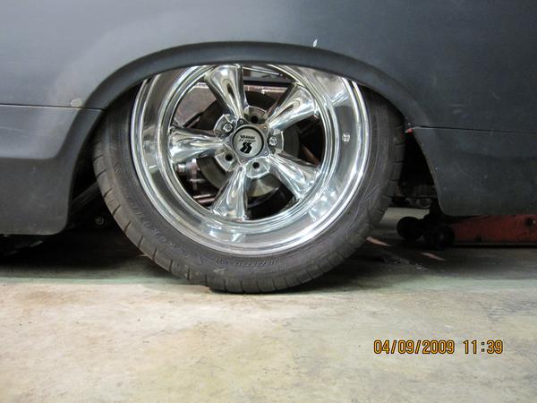 17x11 Torque Thrust II custom made with only 3" back space. Wheels are a total of 11" wide with 12 1/2 inches of rubber!!