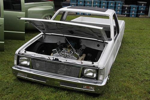 white primer with migthy max front end, billet insert in grille and bumper, shaved doorhandles and locks, cal combo, taillight fillers, and caddy lights, mirrors shaved and finally body droped 3 3/4" lays flat rockers, full 6" flatfloored sheetmetal bed shaved gas door and bed seams, suicide doors, and black rag top