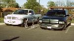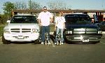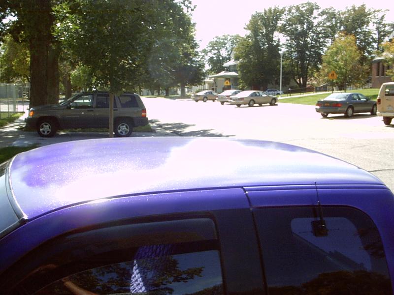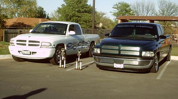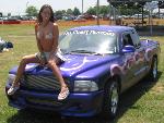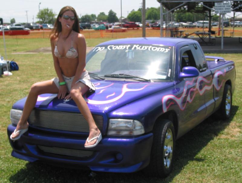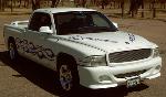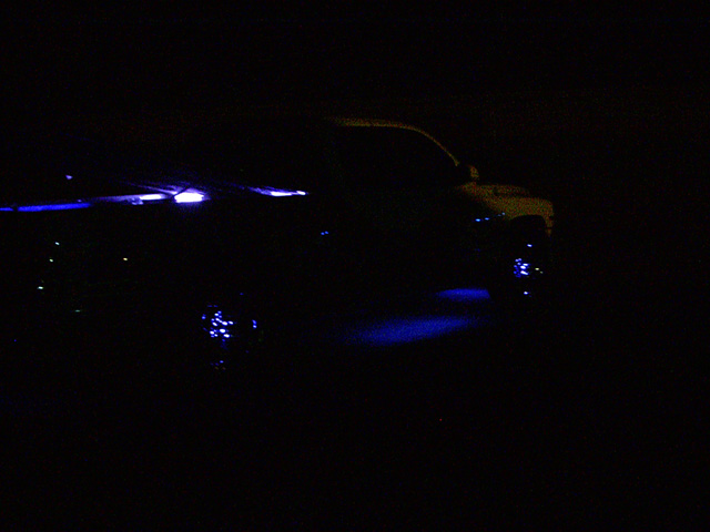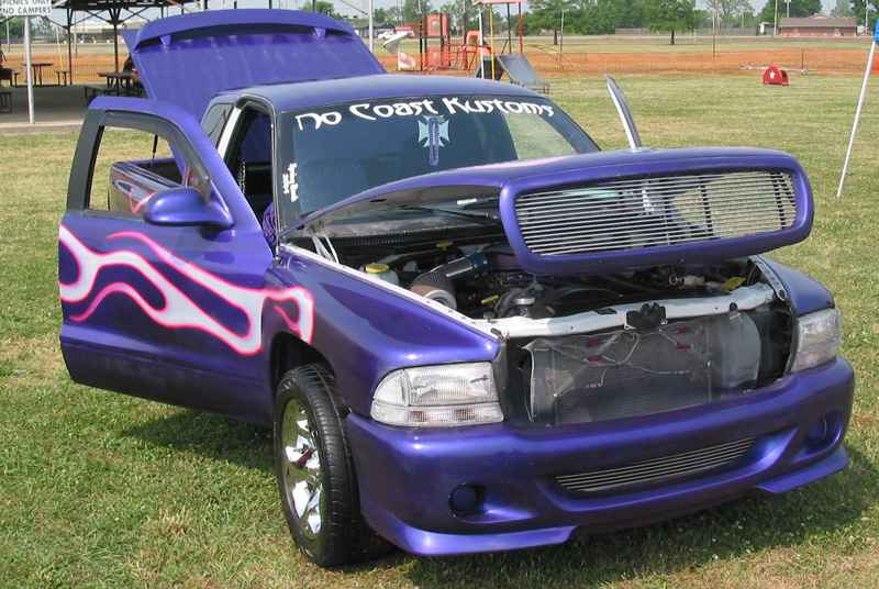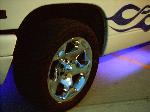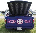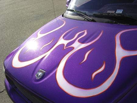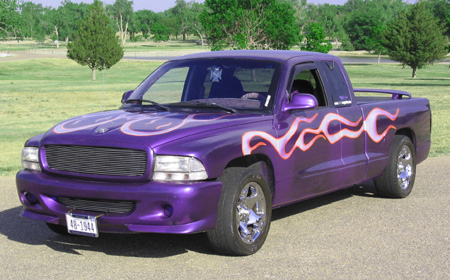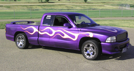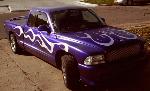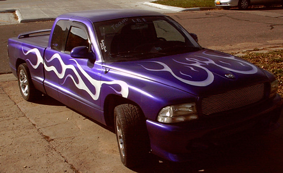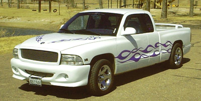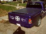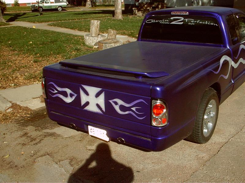 Purple flame graphics (vinyl) on factory white paint, custom roll pan with dual exhaust, Checkmate tonneau cover, clear corners, euro tails, billet antenna, neon underbody lights, shaved handles, phantom grille, bumper cover, Mustang spoiler on tonneau cover to allow me to open the darn thing....