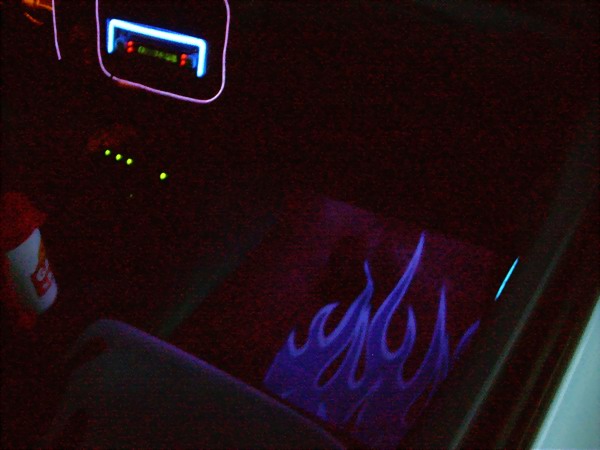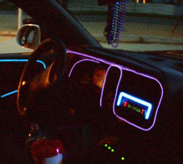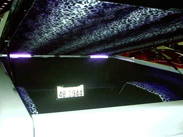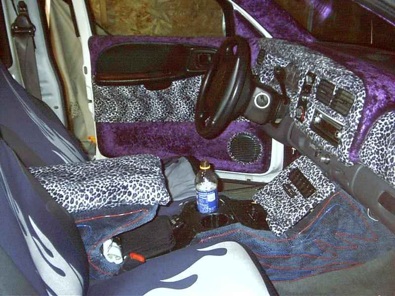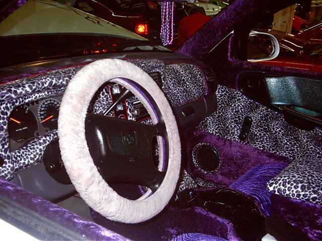 Purple crushed velvet and purple snow leopard interior, custom center console, and a BUNCH of neon.