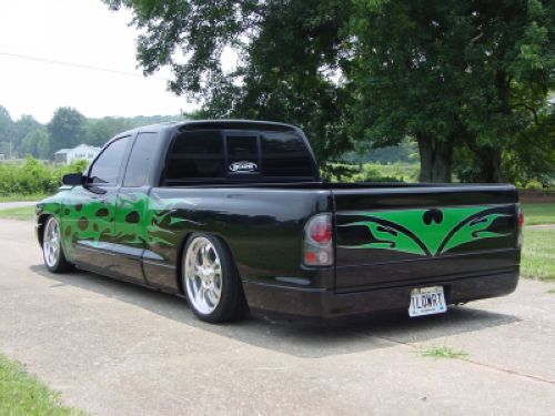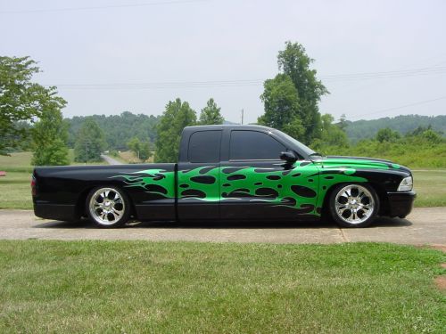 Removed factory fender flares. Shaved: all handles, third brake light, all emblems, gas door. Alter Images rollpan, molded in. Organic Green HOK flames w/ silver outline. Suncoast creations ram air hood, K&N filter. Stull billet grill w/ fiberglass shell molded into hood. Clear corners, carbon fiber euro tails. Streetscene mirrors, custom wheel tubs and, fuel door in bed.