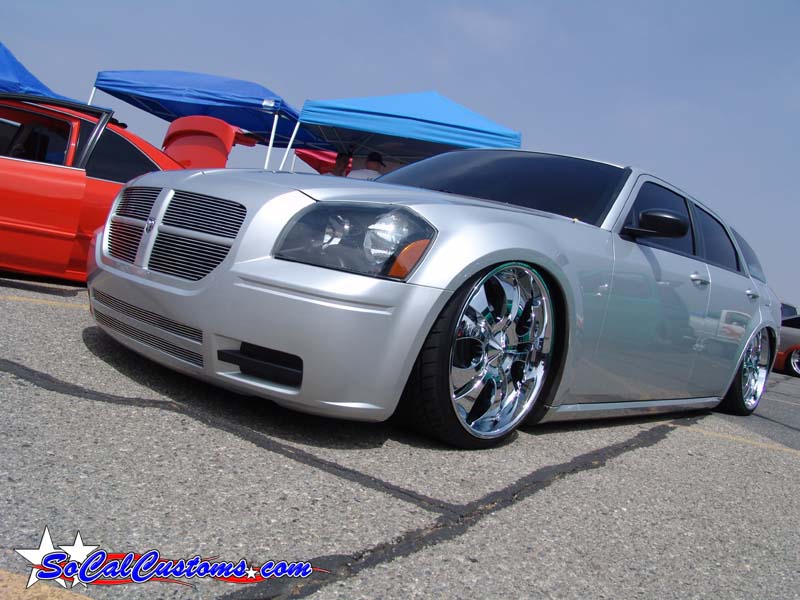 SOLD...Shaved front and rear bumper lines, front emblem, hood squirters, rear wiper, rear tailgate handle. Color changed to royal blue flake and lime time green, billet upper and lower grill, chrome divider ....Paint and body work done by John Owens. 300c chrome door handles all rear no locks. Grunions fabrication cut the car to lay flat