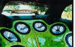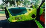 Molded door panels with MTX carved out, custom made speaker box fit to my body, painted fiberglass, neon’s, tweed, vinyl, chrome fire-extinguisher, Water Aquarium