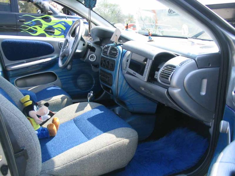 smoothed and painted dash, digital rear view mirror system, PS2 with 7.5 and 5.6 inch screens, full rear roll cage, gray and blue tweed seats.