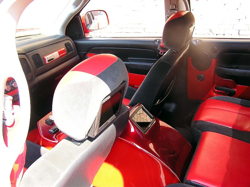 custom red and grey with painted pieces and numerous billet accessories with custom fiberglass console