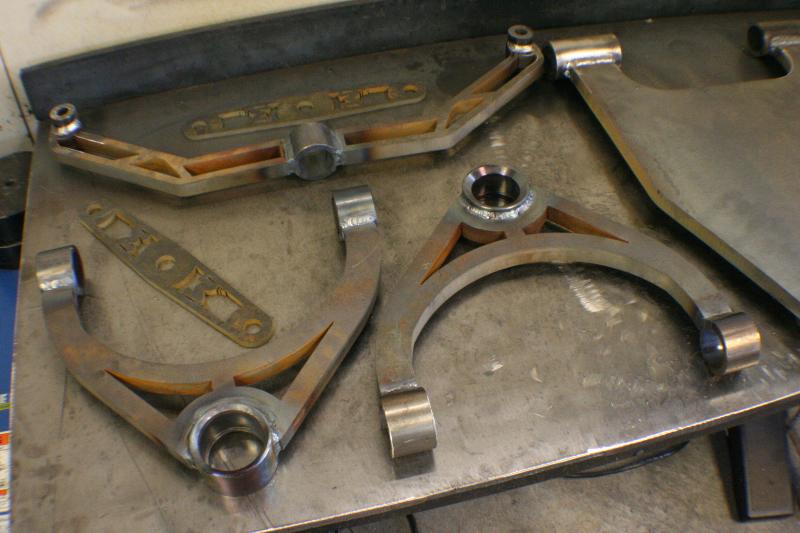 *4 link with a Watts link, Z'd ,Upper and Lower Control Arms with a steering kit to narrow up the front end