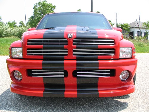 Reflexxion Cowl Induction hood, Keystone dual exhaust roll pan, Mopar hard tonneau, Street Scene heated mirrors, Race Truck Trends bumper cover w/7" driving lights frenched in, Stulle Billet grille inserts