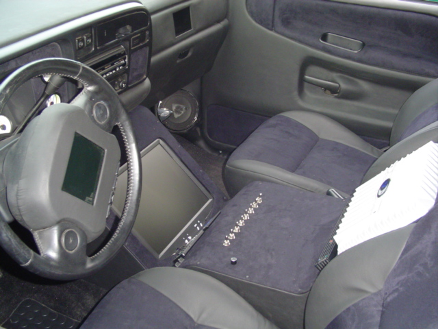 tv in steering wheel, one in passenger side of dash, 15 inch in center console, in dash, 2 12 inch rockford subs